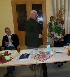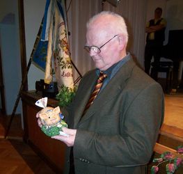 Eine Überraschung brachte uns der Bürgermeister, Herr Jochen Frank. Der Chor spart auf ein neues elektronisches Klavier. Herr Frank übergab unserem Verein daher ein Glücksschwein, dass schon mal eine Spende in seinem Bauch als Grundstock hatte. Mögen ganz viele Spender einen GROSCHEN in unser Sparschwein werfen, damit das neue Klavier bald hell erklingen kann.