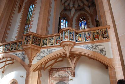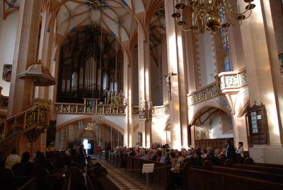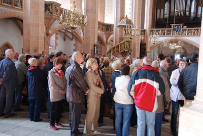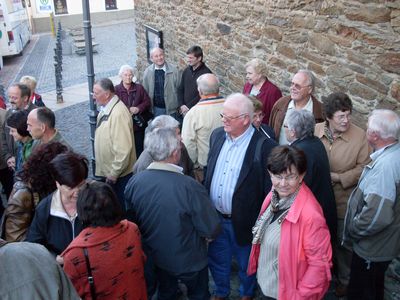 Früh zeitig ging es los und das war ein Verhängnis, denn auf dem Rastplatz Auerswalder Tor mussten wir feststellen, dass wir zwar unsere Fleischproduktion leergekauft hatten und somit tollen Belag für die Brötchen hatten, aber diese fehlten. Oh weh, die standen noch bei Mehnert’s und warten darauf, von uns mitgenommen zu werden. Nachdem der Schreck verdaut war, freuten sich die Verkäufer der Raststätte. So viele Brötchen auf einmal haben die noch nie verkauft. Eine tolle Idee von Günther und schön warm waren sie auch. Gut gelaunt ging es dann weiter nach Annaberg, wo wir uns mit den Freudenberger Sangeskollegen trafen. In der wunderschönen St. Anna Kirche bekamen wir eine sehr interessante und lehrreiche Führung durch die Kirche. Interessante Erkenntnisse gab es bei den Erläuterungen der einzelnen Lebensbilder an der Empore. Schon ganz früher wussten die Menschen, dass Frauen ab 40 den Geldbeutel tragen, etwas zänkisch sind und die Elster im Wappen haben. Bei den Männern haben sie sich zwar etwas im Alter vertan, denn wer kennt einen Mann, der erst mit 80 Jahren Altersstarsinn hat und erst mit 60 einen Wohlstandsbauch.