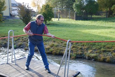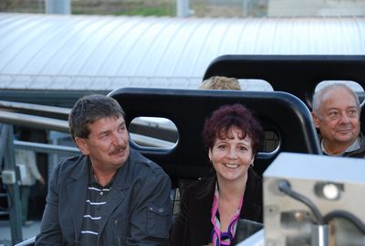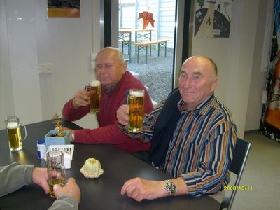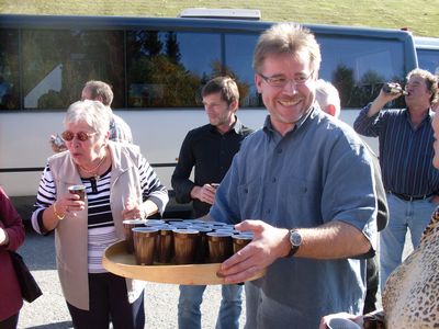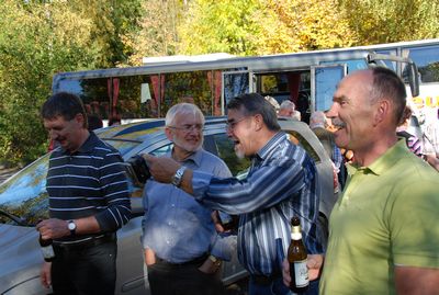 Die Fahrt ging weiter zum Pumpspeicherwerk Markersbach, wo wir unsere Mittagspause bei schönstem Sonnenschein einlegten. Und eine tolle Idee, unserem Geburtstagskind an diesem 11. Oktober zu gratulieren. Der werdende Vater Bodo kam mit ganz viel Sekt im Gepäck und einer kugelrunden Katrin angefahren. Einfach alles optimal. Mit einer guten Grundlage im Magen ging es auf nach Bockau zur Besichtigung der Spirituosenfabrik. Natürlich konnte man die "Wilde Sau" und viele anderen Liköre verkosten, ehe die meisten so richtig den Geldbeutel geschröpft haben. Und ob das wohl am Likör lag, dass Bernd das Spirituosenfabrikschild fast umgehauen hätte??