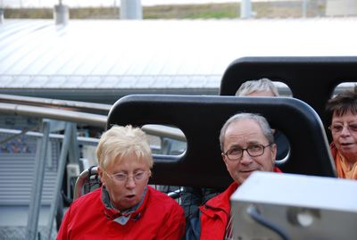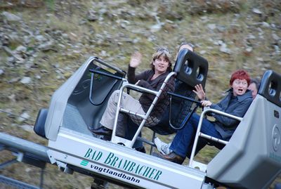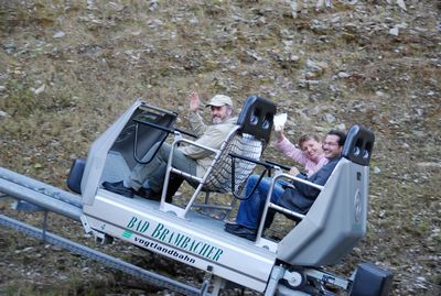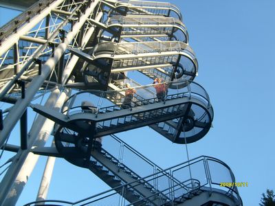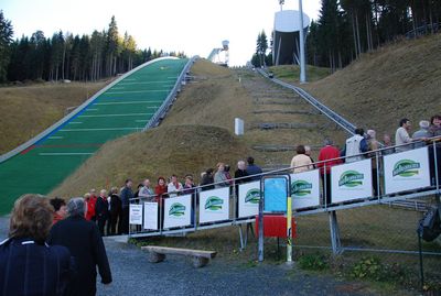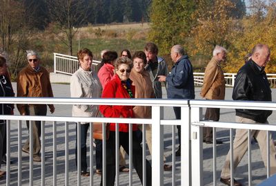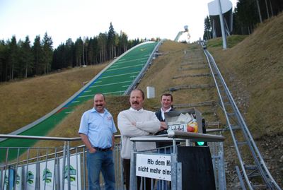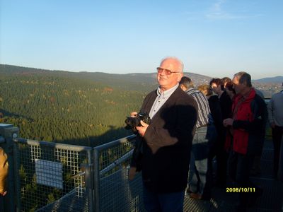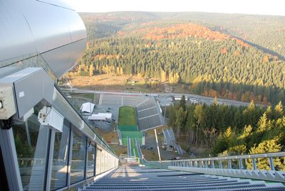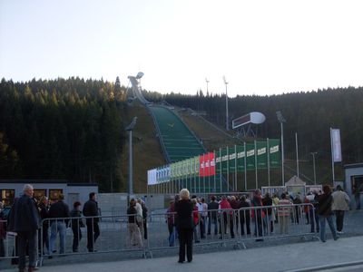 Und wieder ging es hinein in den Bus durch das schöne Vogtland. Gisela konnte sich gar nicht satt sehen an der schönen bunten Laubfärbung. Immer und immer wieder kamen die Worte über ihre Lippen. Aber echt ins Staunen kamen wir dann an der "Aschbergschanze – Vogtland-Arena". Es gab die Möglichkeit, mit Gondeln, Viererwagen auf Schienen, bis ganz nach oben zum Absprung zu fahren, was auch ganz viele nutzten, denn die Rettungssanitäter standen unten ja bereit. Jeder hatte einen Sprung frei!