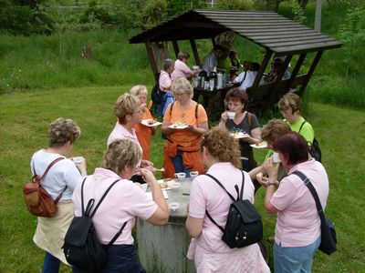 Weiter ging es dann über Wiesen, entlang an Rapsfeldern und durch den Wald in Richtung Stürza. Am Napoleonweg war dann noch einmal ein Haltepunkt, um das grüne Gift, die braune Brühe und den Durchsichtigen zu vernichten, eh wir im Erbgericht Stürza bei Dagmar Herrmann einkehrten.