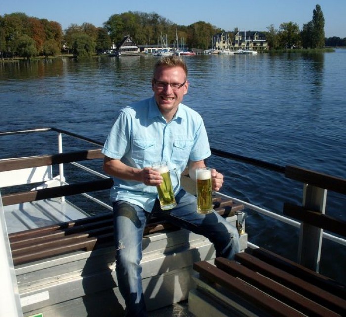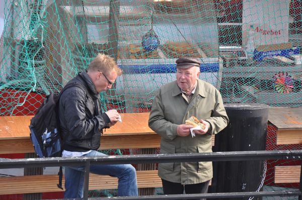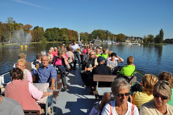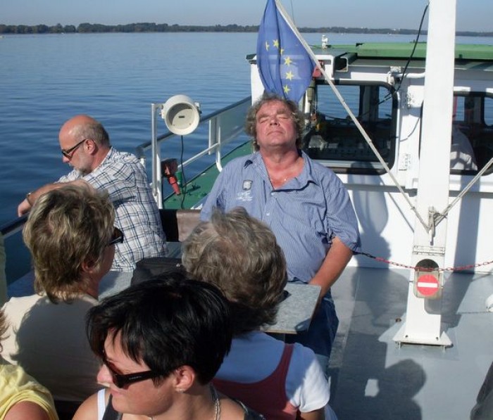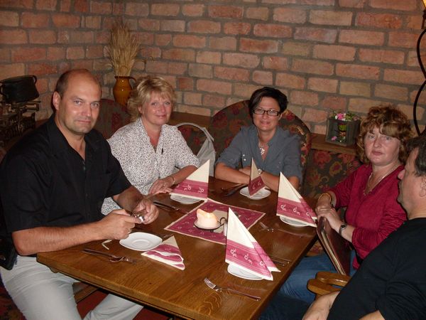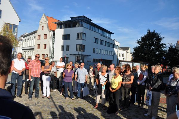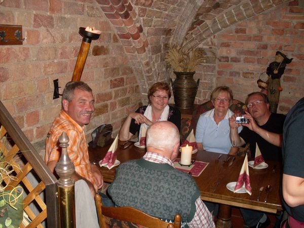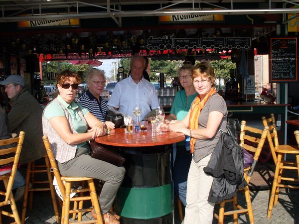 Hinter Berlin machten wir dann auf einem leider ziemlich stinkenden Parkplatz halt und hatten Mühe, ein Plätzchen zum Frühstück zu finden. Gott, sind wir froh, dass Renate immer die Esserei total im Griff hat. Es gab allerlei leckere Sachen zum Stärken und dann auch noch Likörchen aus Eiern und schon konnte die Fahrt weiter gehen in Richtung Röbel. Bei allerallerschönstem Sonnenschein schipperten wir über die Müritz nach Waren. Nach einem kleinen Stadtbummel ging es dann weiter nach Rostock. Nach dem Einchecken im Hotel IBIS sind wir mit einem straffen Fußmarsch zum Essen in den Hopfenkeller eingekehrt. Tolle flotte Bedienung, gutes Essen und ein edler Wein. Alles perfekt und Entschädigung für den langen Fußmarsch. Aber der Tag war doch ziemlich lang. Einige fuhren gleich in das Hotel und andere trafen sich rein zufällig in der gleichen Bar noch auf einen Drink.