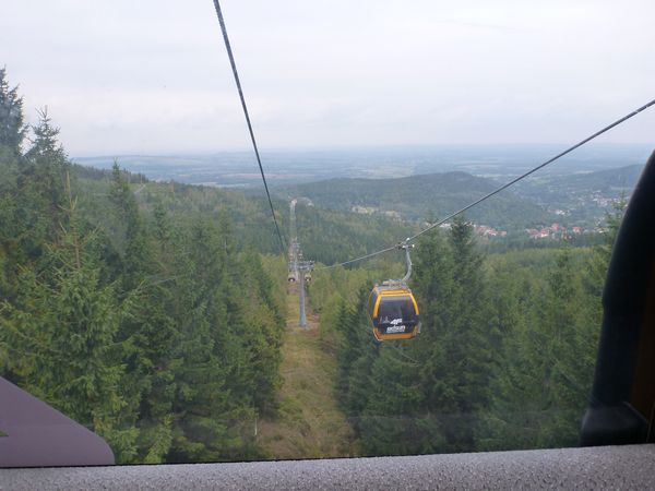 Am nächsten Tag begrüßte uns die Sonne unterhalb der Schneekoppe und auf ging es zur Heufuderbaude, wo wir mit der Bergbahn hinauf auf ca. 1000 m Höhe fuhren und die Aussicht über das Riesengebirge genießen konnten. Ganz schöner Wind war da oben, so dass wir dann beizeiten uns in die Heufuderbaude zurückzogen und uns das Essen und die Getränke munden ließen. Mit der Fahrt durch das Drei-Länder-Eck klang dann ein wunderschönes Wochenende aus.