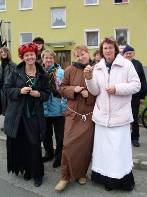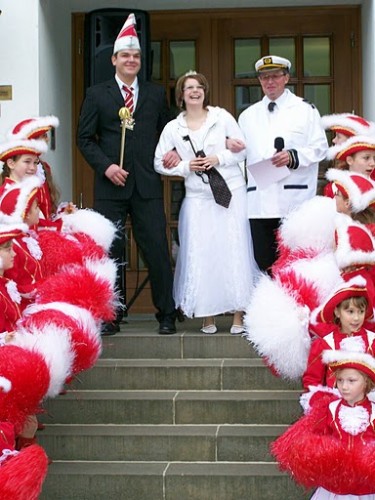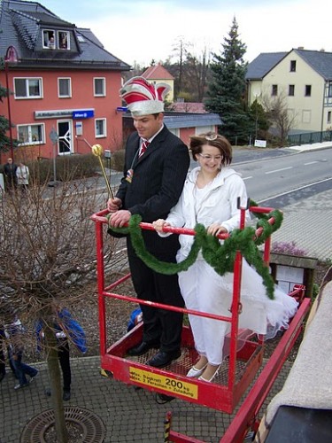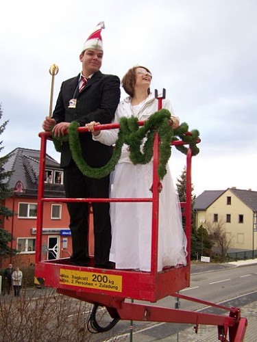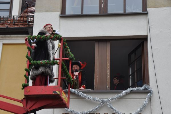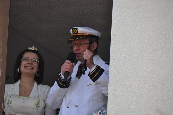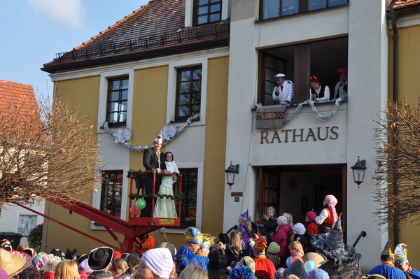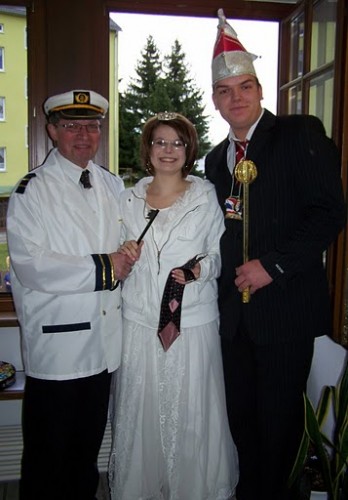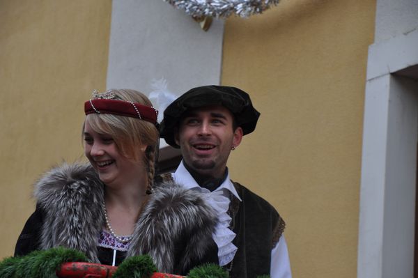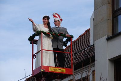 Prinz Franz I. erstürmten als Burgfräulein und ihr Gemahl das Rathaus. Gut, dass es heute moderne Hebetechnik gibt, sonst wäre der Weg ziemlich beschwerlich gewesen. Ihnen zu Ehren jubelte das einfache Volk am Wegesrand und Gemeindehaus zu. Mägde, und Lakain der örtlichen Bäcker und Metzger ließen es sich nicht nehmen, das Gesinde mit köstlichen Speisen zu versorgen.