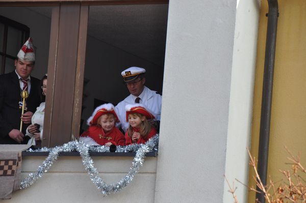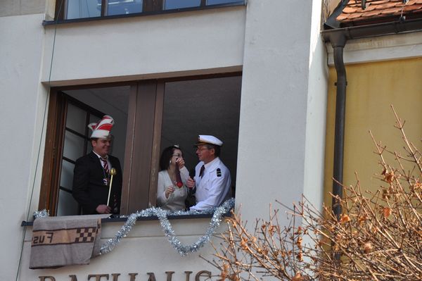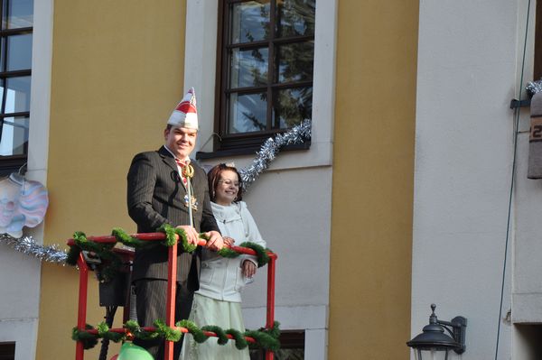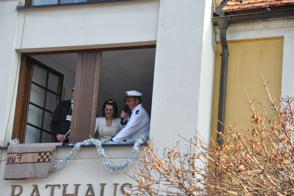 Prinzessin Marie I. und Prinz Sebastian I. konnten zum zweiten Mal die Herrschaft über das Rathaus erobern. Gemeinsam mit den Funkenmariechen Nancy und Liddy grüßten sie das närrische Volk unten auf der Straße und wünschten eine tolle Zeit.