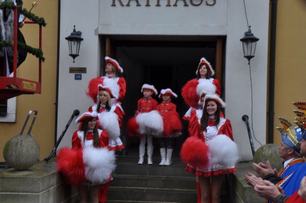 Genau 11.11 Uhr erstürmte der Elferrat, die Funkengarde und Prinzessin Susanne I. und Prinz Andreas I. das Rathaus. Prinzessin Susanne schnitt traditionsgemäß die Krawatte ab und der Bürgermeister übergab seinen Rathausschlüssel an die Narren.